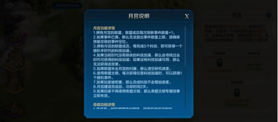 拥有“月宫”的联盟,其成员的刷新事件+1;每完成5个科技,可获得一个本时代科技的科技加速。如果使用的希腊文明,每次科技加速时,可以获得1个随机事件。