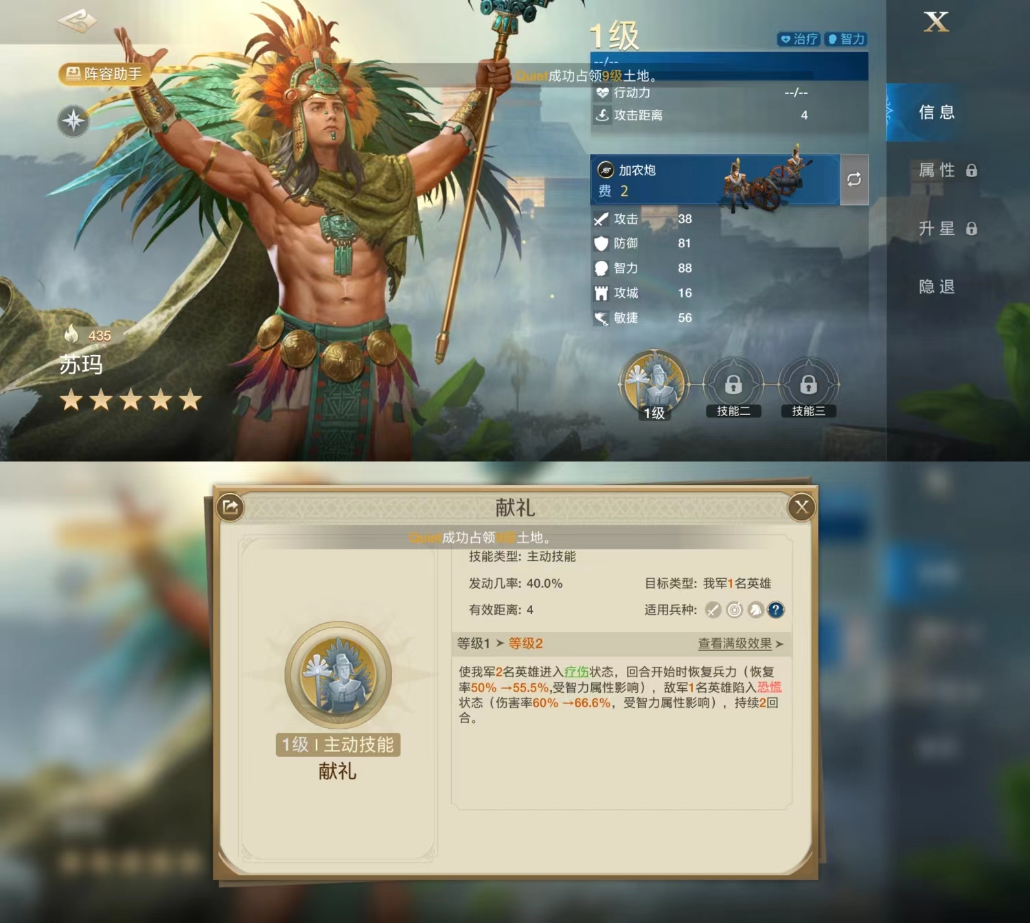 技能为【献礼】,主动技能,距离4,40%发动,治疗与控制相结合的技能,也可以看做是辅助兼控制的技能,比较平衡,对保护我方队友有明显作用。