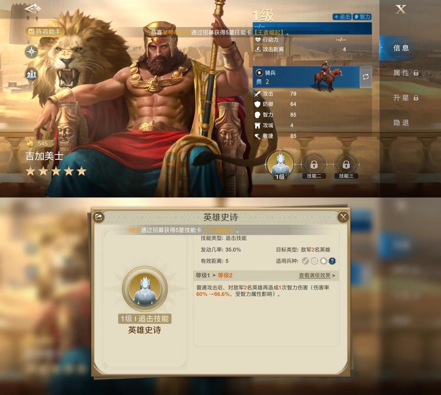 世界启元游戏中玩家开局选择文明后,会对应产生专属的英雄文明卡池。目前古埃及文明英雄中金色英雄包括:克利欧、戴维王、吉加美士、斯基泰女王、法老王、苏玛。其中吉加美士追击/智力英雄,骑兵,普攻距离4。接下来给大家带来了《世界启元》吉加美士技能及阵容搭配推荐,一起了解下吧!