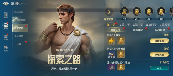 “探索之路”上,玩家在进入游戏的前五天中每天都会解锁不同类型的任务,完成后即可获得大量奖励的活动,未解锁的任务部分可以提前完成,但在解锁任务后才能领取奖励。