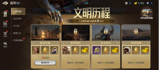 新福利,只要任意充值均可获得时代货币,在不同文明时可消耗货币领取不同阶段的奖励,奖励给得很丰厚。
