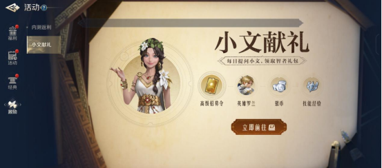 小文献礼依然还在,功能类似每日签到,第一天签到送四星英雄罗兰,后续会有银币、技能点等等,非常不错的每天蚊子腿福利。