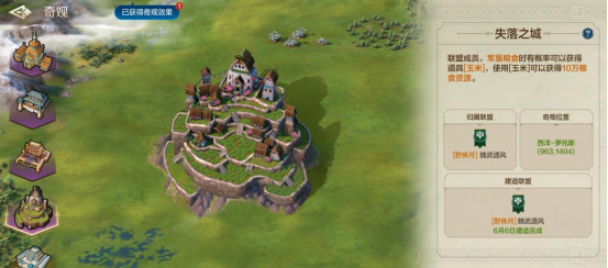 拥有“失落之城”的联盟,其成员在军垦粮食时有概率可以获得道具“玉米”,使用“玉米”可以获得10万粮食。