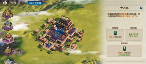 拥有“大浴场”的联盟,其成员在联盟贡献达到目标值时,夜间模式是领地正常速度+100%。