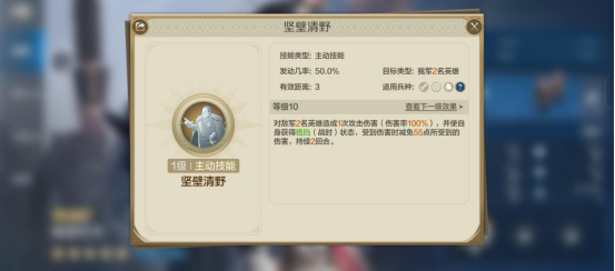 对敌军2名英雄造成一次攻击伤害(伤害率100%),并使自身获得格挡(战时)状态,受到伤害时减免55点所受到的伤害,持续2回合。