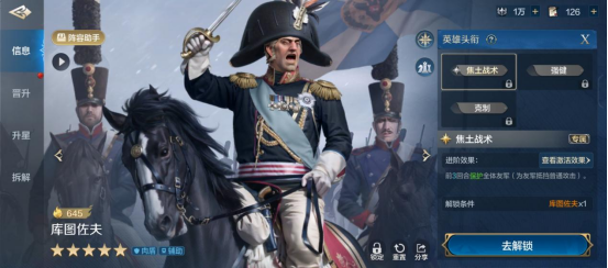技能搭配上,库图佐夫可以带回血及防御类技能,如“重整队形”“破釜沉舟”等等,以提升坦度为主。