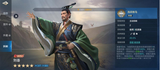 刘备的攻击距离为2,率领的兵种为近战,定位是辅助/治疗。刘备的面板可以说在五星中是一般,也就初始智力87能看,但整体比较均衡,没什么大短板。