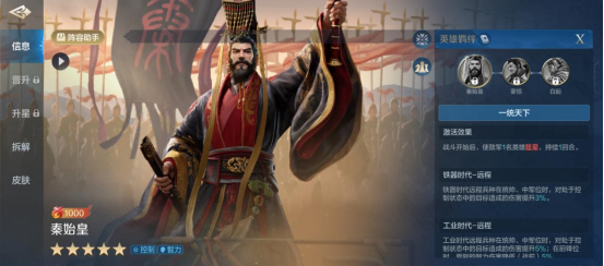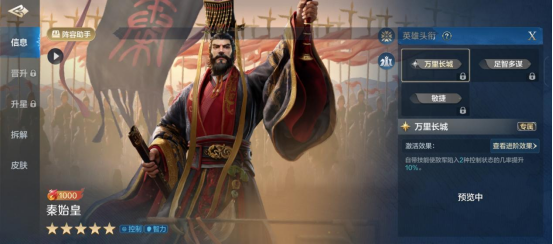 技能搭配上,秦始皇尽量选择控制带输出的技能,次选纯智力输出的技能,像“动于九天”“决水千朲”都是不错的选择。