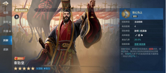 秦始皇率兵的兵种是远程兵种,攻击距离为4,定位是控制与智力,面板则是标准的智力输出英雄面板。
