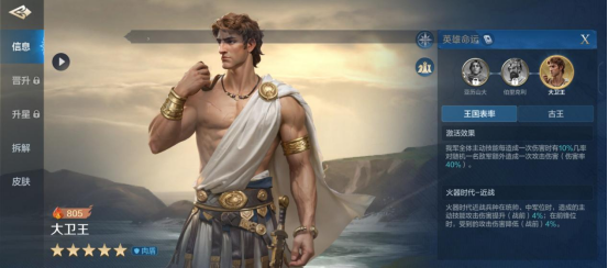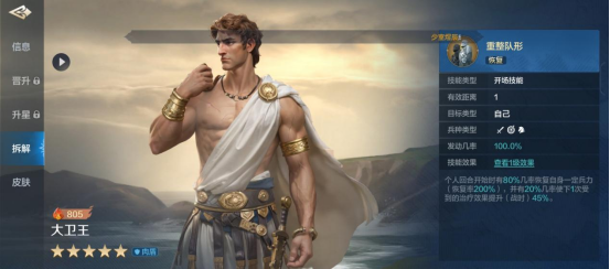 超强的自恢复治疗技能,几率高、治疗量大还有额外治疗量提升,带这个技能的英雄必然回复能力拉满,不过因为只能对自己释放的缺点,导致只有坦克带比较适合,但对大卫王自己来说非常适配。