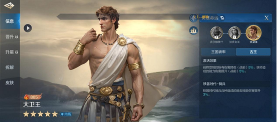 技能搭配上,大卫王基本力求抗揍,自疗或坦度技能都很推荐,如“重整队形”“寒光铁衣”都是不错的选择。