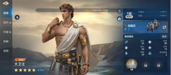 大卫王的攻击距离为2,非常短,率领的兵种为近战,定位是肉盾。就坦克面板来说,大卫王只能算优质,而非顶级,初始防御99,初始攻击则是81,还能打一点输出。