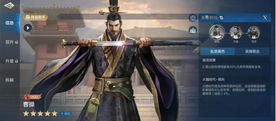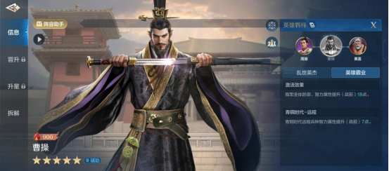 两个四星与曹操搭配的命运羁绊,提升防御与智力面板的效果只能说还行,搭配优先度不高。