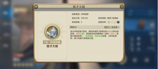 效果:战斗开始后前3回合,使我军2名英雄造成伤害提升(开场)20%受智力属性影响。