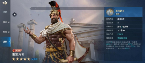 伯里克利的攻击距离为3,率领的兵种为骑兵,定位是攻击。就面板来说,初始防御与敏捷为96、97,伯里克利可像是防御英雄。