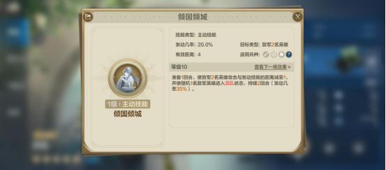 其自带技能为“倾国倾城”,满级效果为: