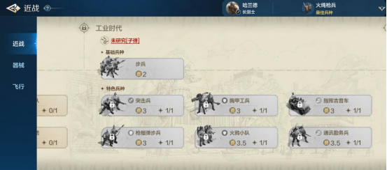 近战兵种的解锁有两个前提,一个是掌握关键核心科技,一个是解锁对应特殊战略资源。