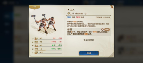 唯一比较特殊的是,铁器时代的特色兵种“工人”,他们的战斗力很弱,只有攻城值高,其特性能力是少有的功能向辅助兵种。