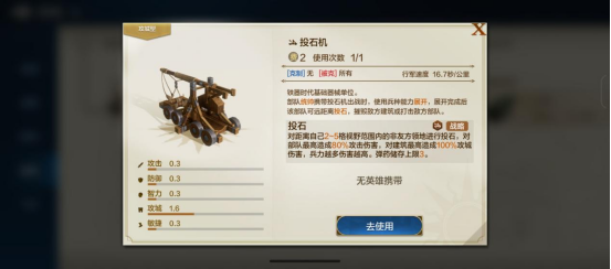 同时,所有器械兵种都有弹药上限与填装机制,统一弹药上限为3枚,每次攻城技能攻击都会消耗1枚弹药,弹药归零就无法攻击,需等待10分钟恢复1枚弹药才能继续攻击,也可以等到30分钟让弹药回满。