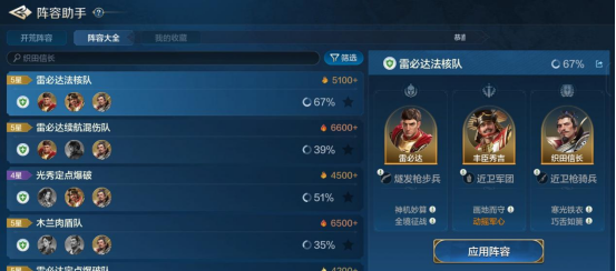 搭配方面,织田信长需要的是以主动技能为主的队伍,且有着长时间稳定输出的最佳。因此,以稳定著称的“雷必达”与“亚历山大”都是很不错的C位(统帅位)选择,而第二位中军辅助则推荐“丰臣秀吉”,作为稳定法队输出,强度非常不错。