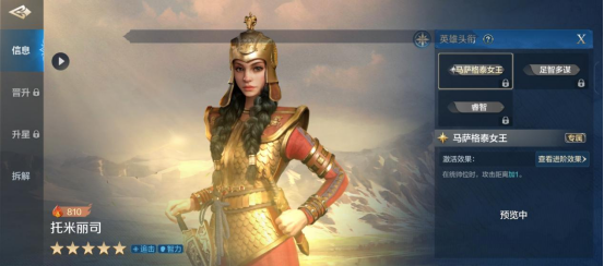 专属头衔“马萨格泰女王”在未进阶前,效果一般,4距离本就不短变为5距离,实用性不大,但进阶效果质变,前3回合的先手状态,能让其控制技率先控制对手,非常强力,若能进阶必首选。