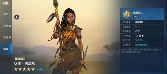 安娜·恩津加率领的兵种是远程兵种,攻击距离为3,定位是辅助。面板数值方面突出,初始攻击82,初始防御100,身板相当硬。
