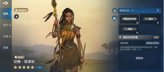 恩东戈守护者:自带技能提升属性的效果对我军全体生效(进阶额外效果:同时发动几率提升(战前)4%)