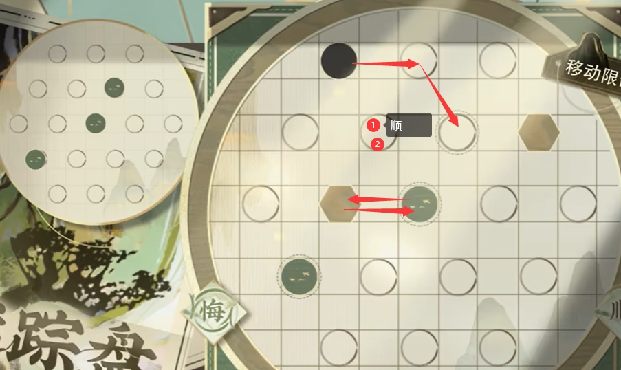 第一/二步:点击 2-2 顺时针旋转 2次(3-3点位的棋子因为禁行点位的关系顺时针不会被挪动)