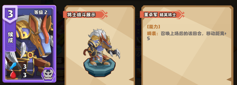 侯成的【瞬袭】能力,在快攻是独一档的强力:召唤上场当回合移动距离+5,如果敌方战场上没有阻挡的话,能一回合直接压到敌方棋盘底线上。侯成与孙策的配合,更多的是作为占位的将士。因为孙策飞到敌方底线后攻击召唤的羽灵不能完全占据孙策周围的格子,有可能被【警戒】的枪兵击败。侯成可以提前在中路压到对方底线后,为孙策护航,减少孙策被【警戒】威胁的可能性。
