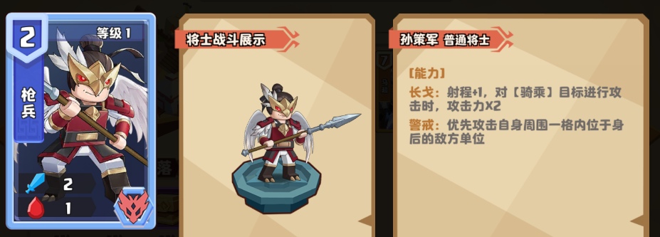 战斗前期,如果没有伤害法术,也没有具备【警戒】能力的将士对孙策造成伤害的话,孙策不仅可以打出大量伤害,还能召唤大量的羽灵占据敌方的棋盘格子,使对方无法部署自己的将士。