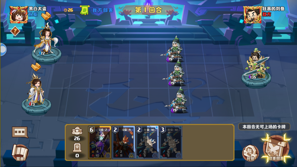 后续如果有一方的主公血量不多(小于15点),8-9回合登场的黄盖和寒冰法师威胁很大。寒冰法师是无法被技能选中的,但是黄盖可以。因此血量不健康的话一定要给黄盖的登场留好技能快速处理或控制住。