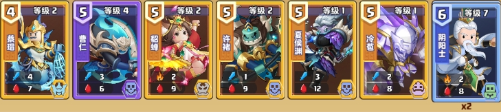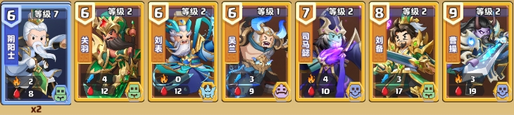 紫卡(7级):黄盖(第7-8回合固定上一个),孙韶,廖化,李严,关平,凌统,简雍,韩当,小乔,马岱