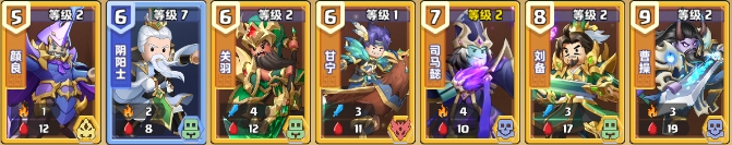 金卡(5级):颜良(开场),刘备(开场),赵云(开场),李儒(第二回合固定出),严颜,文聘,蔡瑁,吕布,吴兰,夏侯渊,甘宁,司马懿,郭嘉,马超,高览,徐庶,太史慈,貂蝉,关羽,曹操,刘表,孙策,周瑜,田丰,董卓