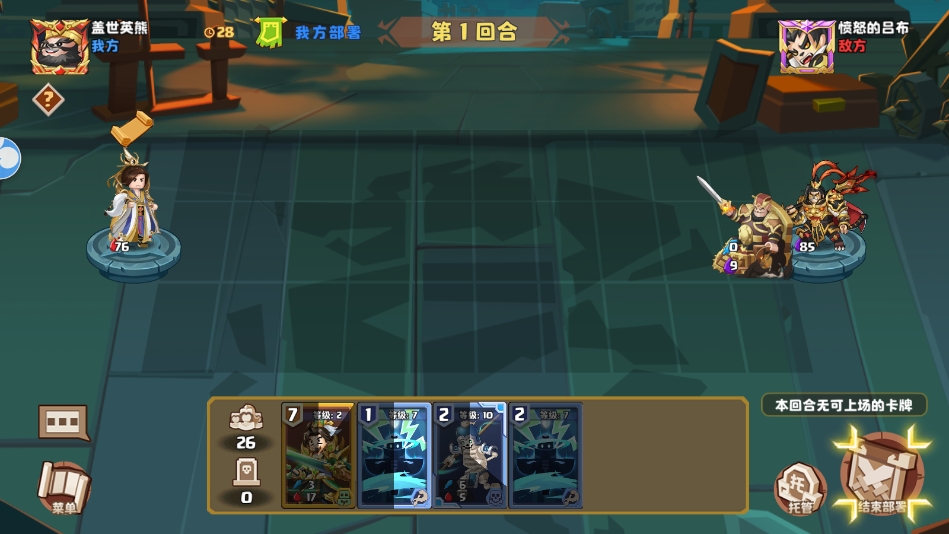 开局一切目标都以第一时间击杀董卓为目标,所以开局起手的牌尽量去追:天罚,火球术,斩击,冷箭这些直接能秒杀董卓的技能卡。其次就是胡车儿,蔡瑁,灵矢这种落地既能直接对董卓制造伤害的单位。