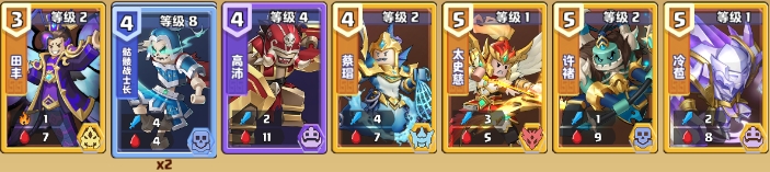 紫卡(3-4级):郭汜(开局第3回合固定2个),李傕(开局第3回合固定1个),胡车儿,逢纪,许攸,霍骏,乐进,高沛,蔡夫人,辛评,袁尚,侯成,张允,雷铜,刘璋