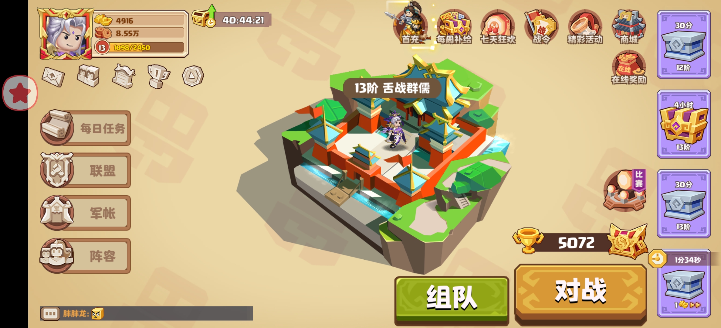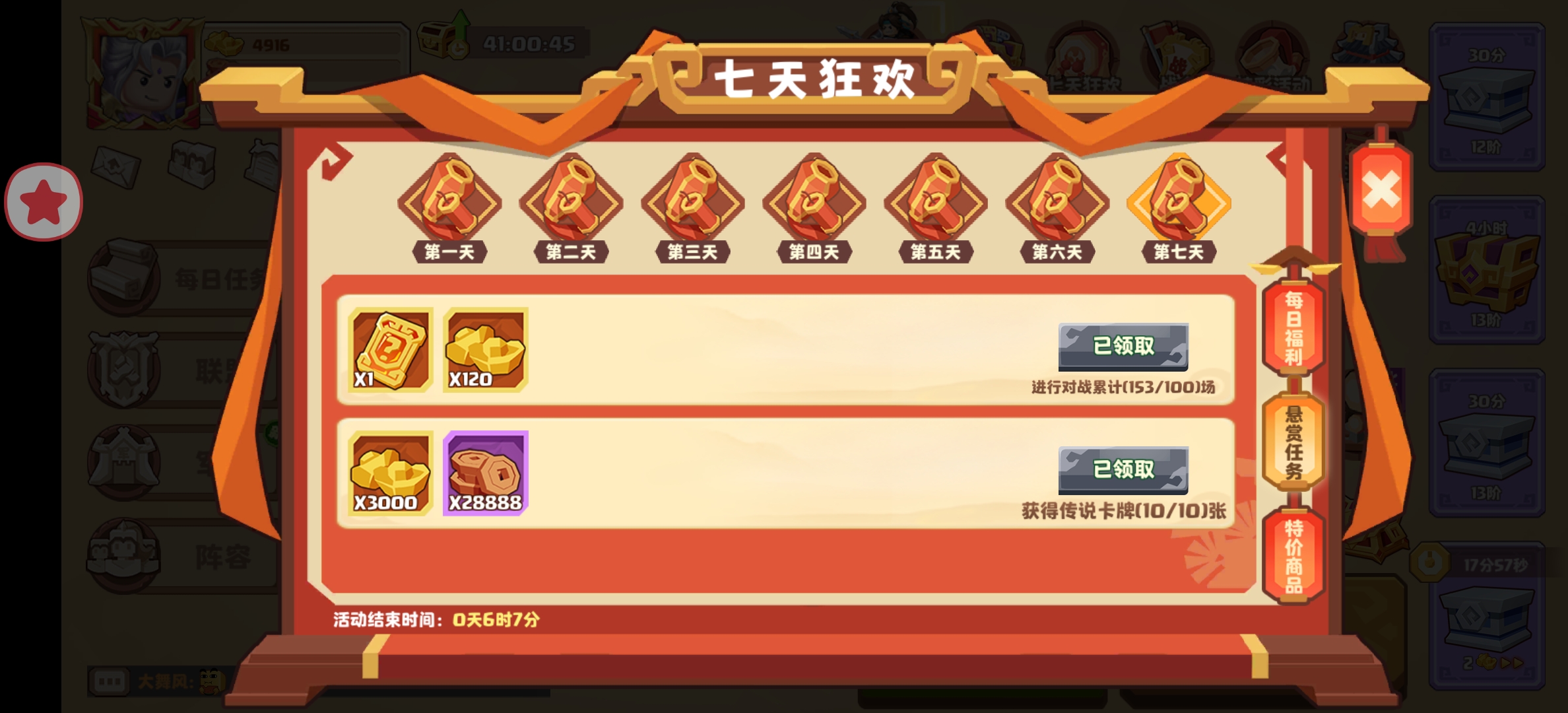 新人上线,会有《七天狂欢》,不仅能得橙卡,每攒够2/4/6/8/10张橙卡还能领元宝和铜币,活动最后一天的时候我已经9张橙卡了,心想如果打不出箱子就来个首充,结果对战送了个神金箱,开了个华雄,直接搞定,这一波稳赚。