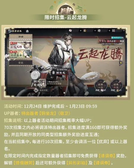 UP器者:特出器者【铜坐龙】(宿卫)招集说明:以上器者活动期间招集概率大幅UP;70次招集之内必将调派特出器者,招集进度满160即可获得额外奖励,并且同期开放的同类型招集额外奖励进度互通:在当前招集中,每进行10次招集,至少会调派一位【优异】或以上器者。