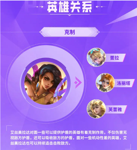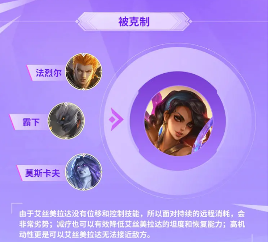 装备成型后的艾丝美拉达有着不错坦度和不俗的持续输出能力既可以持续追击敌方以一打多,也可以在合适的时机使用大招接近并控制敌方后排英雄,达到开团的效果。