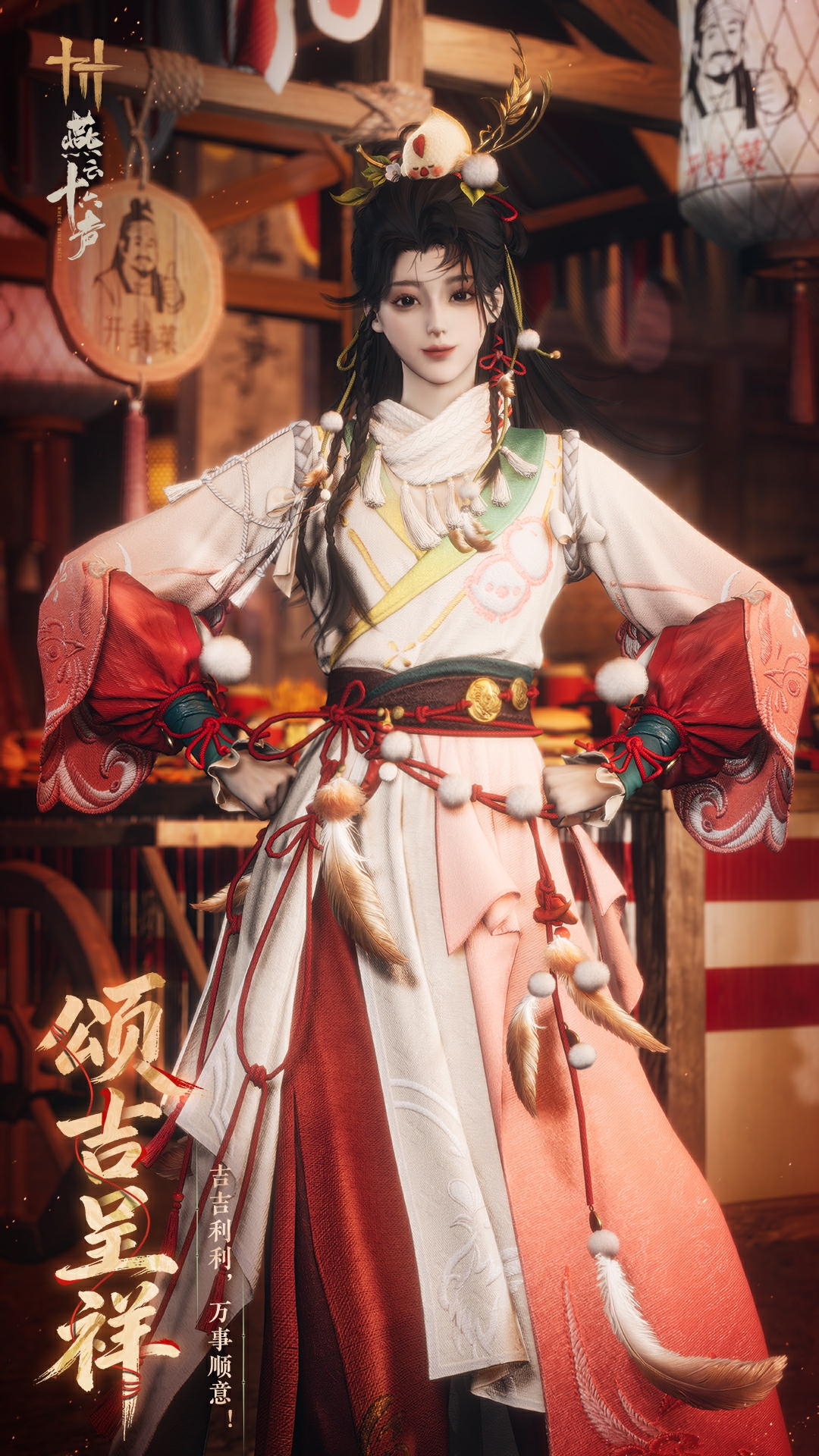 活动主题套装【颂吉呈祥】预计将于3月27日至4月17日期间限时上架,届时游侠可以680长鸣珠购得。套装将支持上下装拆分和染色,并附赠发饰。