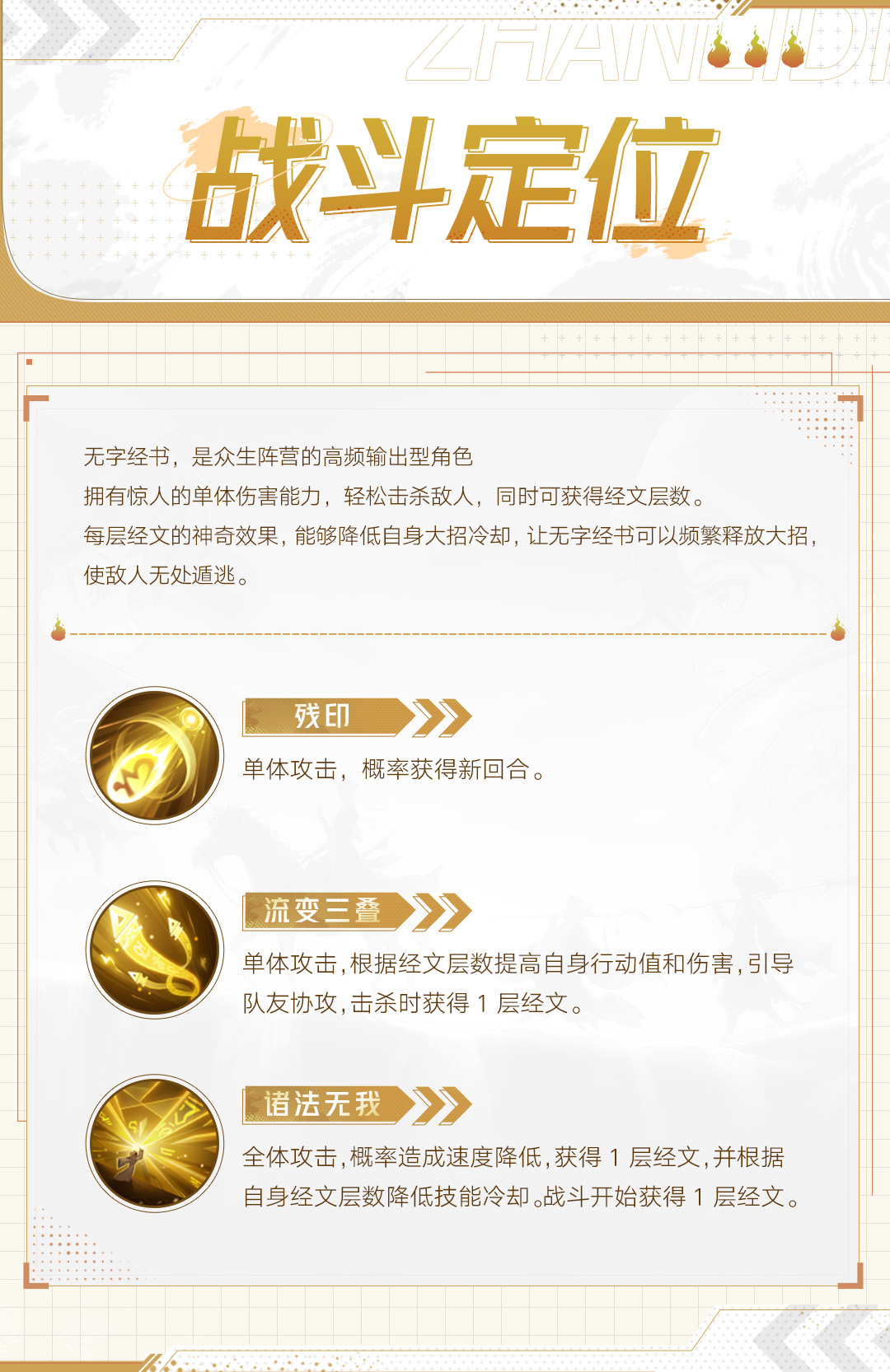 单体攻击,根据经文层数提高自身行动值和伤害,引导队友协攻,击杀时获得1层经文。
