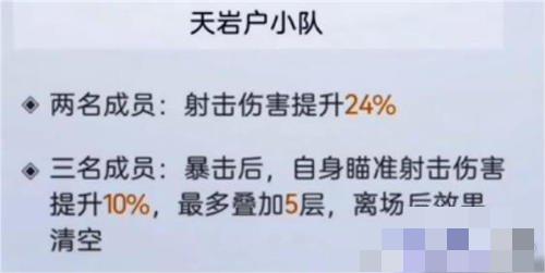 天岩户小队对应的则是射击伤害,最多能给射击伤害提升百分之七十四,天岩户小队也是典型的万金油,主c都可以考虑带。