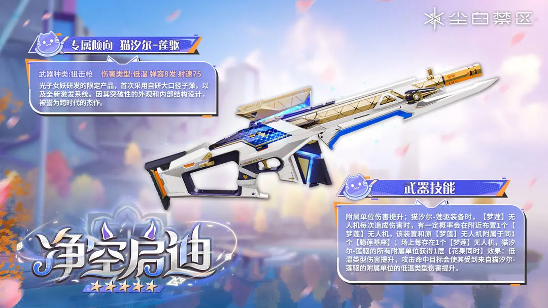 首件登场武器为“净空启迪”,其专属适配干员为猫汐尔-莲驱。该武器定位为高协同型狙击装备,核心机制围绕“梦莲”无人机展开:每次无人机造成伤害时,有概率在目标附近生成一枚同类型无人机;场上每存在1台“梦莲”无人机,所有附属单位即获得1层“花果同时”效果。该效果可提升低温伤害类型倍率,并使攻击命中时额外触发一次基于武器附属单位的低温属性伤害。