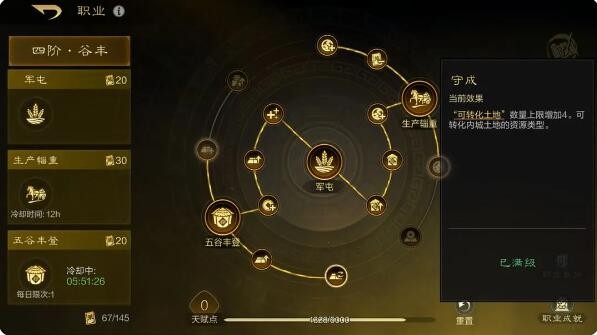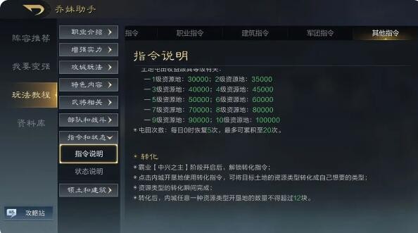 顾名思义,就是可以将内城的资源地转化成其他资源,比如石头地换成粮食地之类的,点击资源地,到时候会出现“转化”指令。不过一种资源地的数量不能超过12块——司仓除外,司仓有一个技能可以让他转化16块资源地,所以这一点也可以考虑到后期转职的考虑因素中。