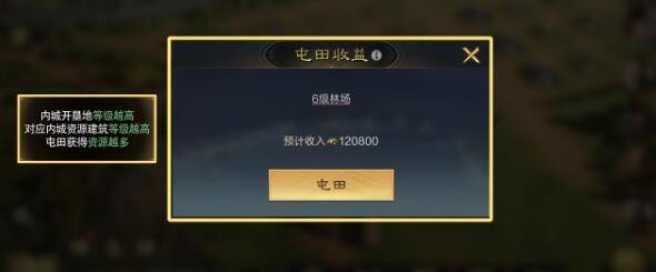 2. 根据实际情况选择屯田时机。开垦地与对应内城资源建筑的等级越高,屯田获得的资源越多,但1-5级的开垦地屯田资源差距并不大,主公还是得根据自身实际情况选择屯田时机,好钢用在刀刃上。