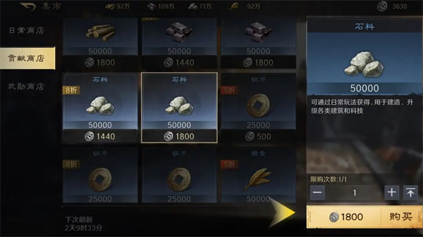 贡献商店中花费同盟贡献可以兑换石料,每周可兑换3次。