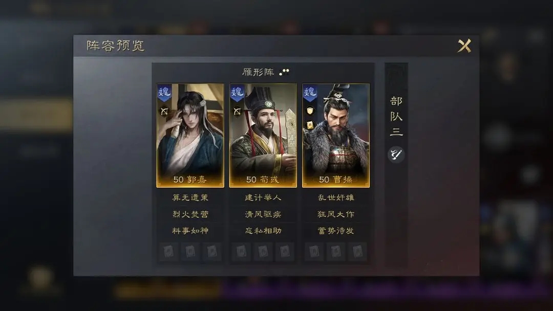 荀彧自带战法能有效提升我方全体的“奇谋”和“看破”,增加队友谋略输出伤害,并且搭配具有恢复效果的战法后,极大地提升了部队的持续作战能力,为郭嘉创造出更多输出机会。曹操自带战法能够帮助部队减伤,并且狂风大作能够配合郭嘉打出更高伤害。