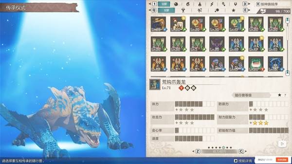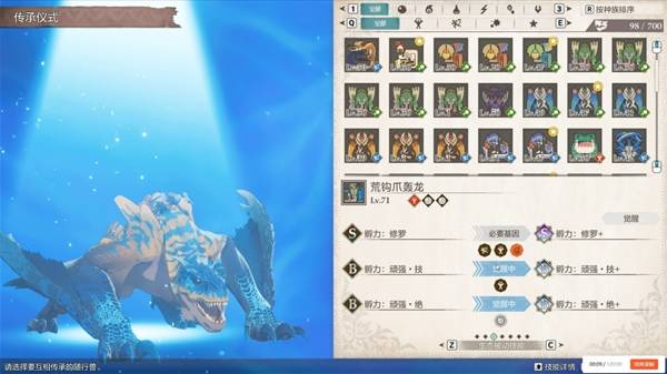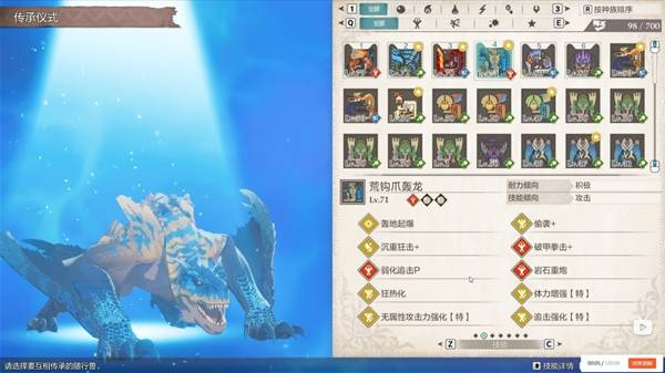 关于特定技能,偷袭是毒怪鸟自带技能,沉重狂击和岩石重炮是荒钩爪自带技能,破甲拳击是黑轰龙自带技能,狂热化是恐暴龙自带技能,弱化追击 p 则是冰土砂龙自带技能。