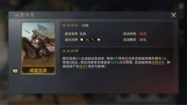 【威震华夏】主动战法,提升自身主动战法发动率对敌军全体造成伤害。敌军有控制效果可以发动“逃兵”效果。