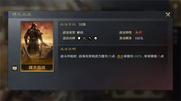 【裸衣血战】被动战法,战斗开始提升自身的先攻、武力值、连击率,降低统率。