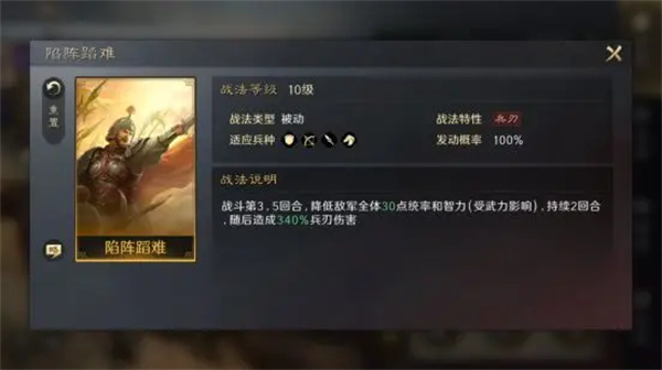 【陷阵蹈难】被动战法,在第3,5回合降低敌方全体统率和智力并造成伤害。